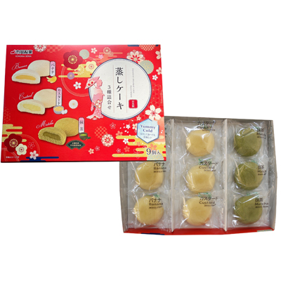 - ふんわり生地にクリームを詰めた蒸しケーキ(カスタード・抹茶・バナナ)のアソートギフト